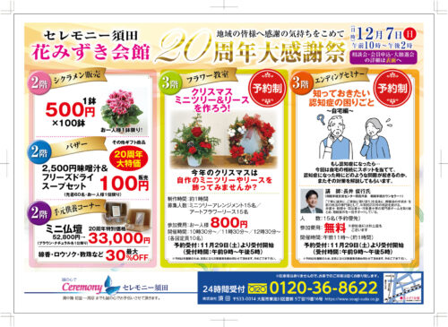 そこでこれまでのご愛顧に感謝の気持ちを込めて花みずき会館20周年記念感謝祭を行います。